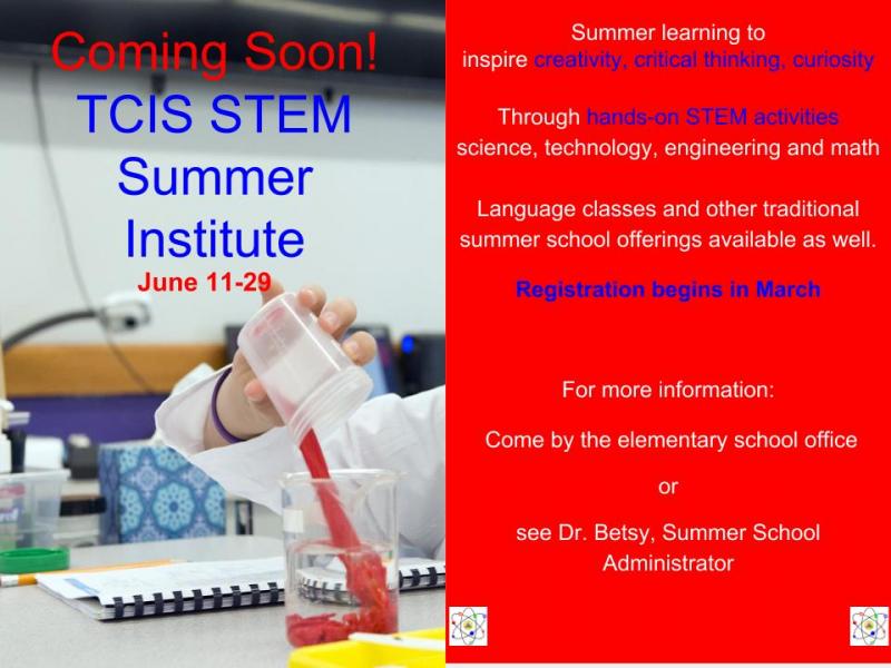 This summer TCIS is offering students The TCIS Summer Institute with hand's on STEM activities that inspire creativity, critical thinking and curiosity. See Dr. Betsy in the elementary school for more information. Please note that language and other summer school classes will be offered as well.